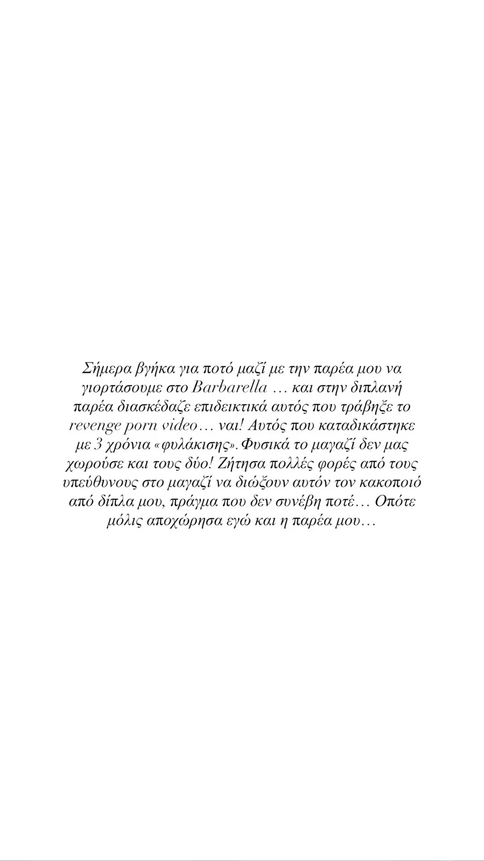 «Σήμερα βγήκα για ποτό μαζί με την παρέα μου να γιορτάσουμε και στη διπλανή παρέα διασκέδαζε επιδεικτικά αυτός που τράβηξε το revenge porn video… Ναι! Αυτός που καταδικάστηκε με 3 χρόνια «φυλάκισης». Φυσικά το μαγαζί δεν μας χωρούσε και τους δύο! Ζήτησα πολλές φορές από τους υπεύθυνους στο μαγαζί να διώξουν αυτόν τον κακοποιό από δίπλα μου, πράγμα που δεν συνέβη ποτέ… Οπότε μόλις αποχώρησα εγώ και η παρέα μου…» έγραψε η Ιωάννα Τούνη.