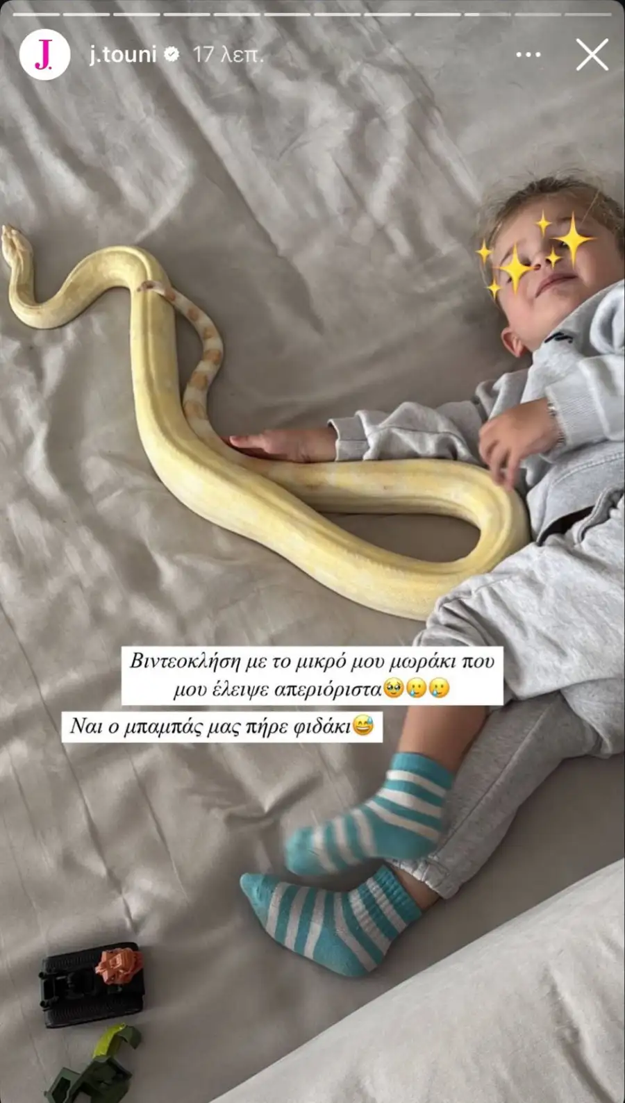 «Βίντεο κλήση με το μικρό μου μωράκι που μου έλειψε απεριόριστα. Ναι ο μπαμπάς μας πήρε φιδάκι» έγραψε η Ιωάννα Τούνη.