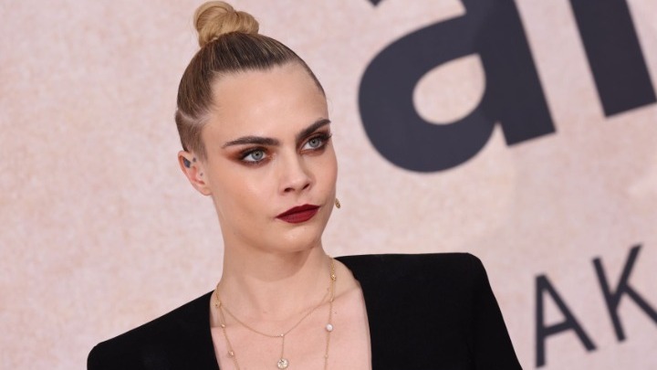 Η Κάρα συνεργάζεται με τον οίκο Λάγκερφελντ σε μια συλλογή από βιώσιμα υλικά. Στην εκδήλωση φόρεσε ένα oversized σακάκι σμόκιν με μια ζώνη που έγραφε το όνομα του εμβληματικού σχεδιαστή περασμένη γύρω από το λαιμό της και μία αντίστοιχη στη μέση της. Ολοκλήρωσε την εμφάνισή με ψηλές καστόρινες μαύρες μπότες.