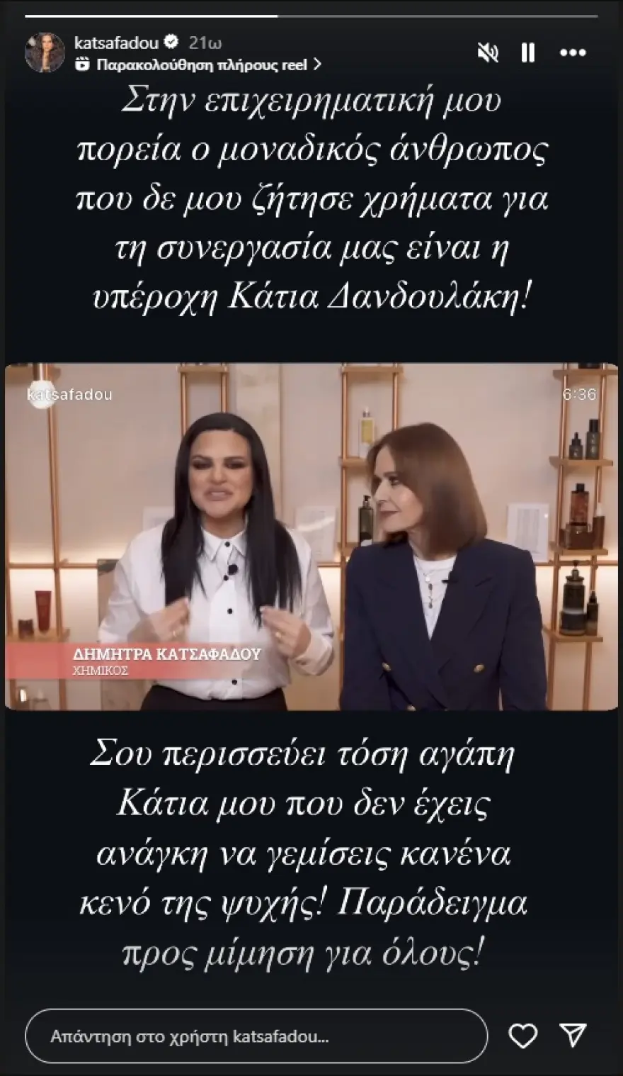 Με τη σειρά της, η Δήμητρα Κατσαφάδου επιβεβαίωσε τα λεγόμενα της ηθοποιού, γράφοντας σε story στο Instagram: «Στην επιχειρηματική μου πορεία, ο μοναδικός άνθρωπος που δεν μου ζήτησε χρήματα για τη συνεργασία μας είναι η υπέροχη Κάτια Δανδουλάκη. Σου περισσεύει τόση αγάπη Κάτια μου που δεν έχεις ανάγκη να γεμίσεις κανένα κενό της ψυχής. Παράδειγμα προς μίμηση για όλους».