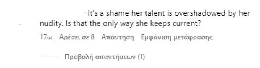 «Ποιος ο λόγος;», έγραψε κάποιος, με έναν άλλο να προσθέτει: «Χωρίς νόημα» ή ότι «το ταλέντο της σκιάζεται από αυτή τη φωτογραφία».