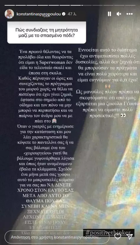 Σχεδόν ένα μήνα μετά σας γράφω αυτό το μακροσκελές κείμενο για να σας πω να δίνετε χρόνο στον εαυτό σας, μετά από αυτό το θαύμα που σας συνέβη και να μην ξεχνάτε ότι η λεχώνες είμαστε – είστε είναι πολύ ευαίσθητες», ανέφερε, μεταξύ άλλων, η Κωνσταντίνα Σπυροπούλου.