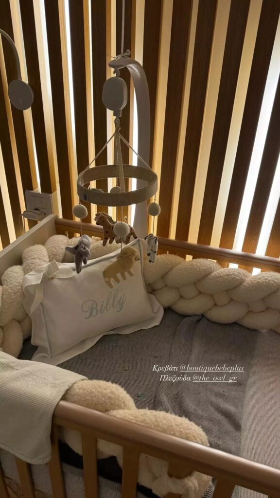 Πριν από λίγες ώρες, θέλησε να δείξει το παιδικό δωμάτιο του μικρού Βασίλη. Μία ξύλινη κούνια με παιδικά κουκλάκια και μαλακές «πλεξούδες» πρωταγωνιστούν, ενώ στο μαξιλάρι γράφει το όνομά του.