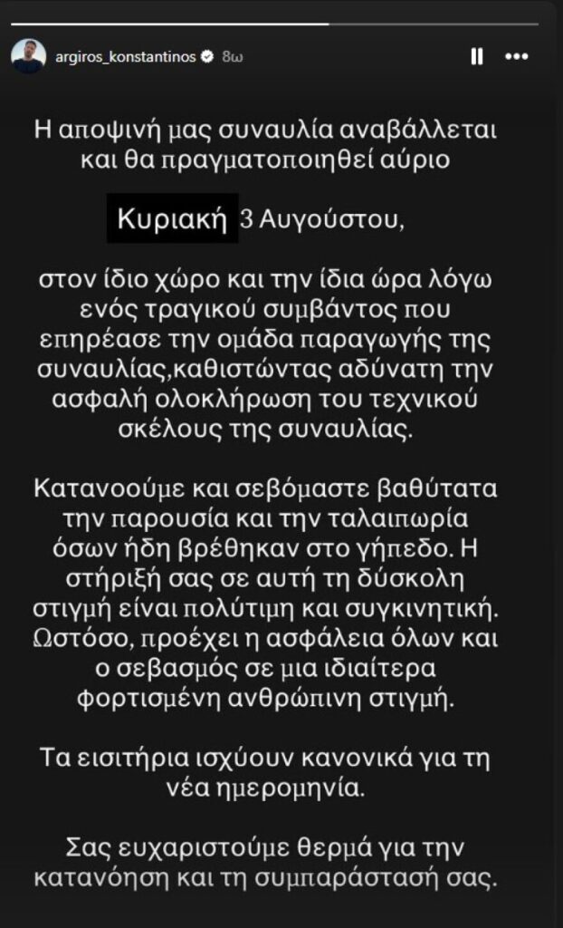 «Η αποψινή μας συναυλία αναβάλλεται και θα πραγματοποιηθεί αύριο, Κυριακή 3 Αυγούστου στον ίδιο χώρο και την ίδια ώρα, λόγω ενός τραγικού συμβάντος που επηρεάζει την ομάδα παραγωγής της συναυλίας, καθιστώντας αδύνατη την ασφαλή ολοκλήρωση του τεχνικού σκέλους της συναυλίας. Κατανοούμε και σεβόμαστε βαθύτατα την παρουσία και την ταλαιπωρία όσων ήδη βρέθηκαν στο γήπεδο. Η στήριξή σας σε αυτή τη δύσκολη στιγμή είναι πολύτιμη και συγκινητική. Ωστόσο, προέχει η ασφάλεια όλων και ο σεβασμός σε μία ιδιαίτερα φορτισμένη ανθρώπινη στιγμή. Τα εισιτήρια ισχύουν κανονικά για την νέα ημερομηνία. Σας ευχαριστούμε θερμά για την κατανόηση και την συμπαράσταση σας», ανέφερε ο τραγουδιστής.