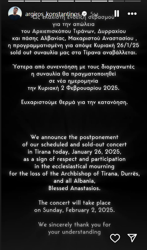 «Ως ελάχιστη ένδειξη σεβασμού για την απώλεια του Αρχιεπισκόπου Τιράνων, Δυρραχίου και πάσης Αλβανίας, Μακαρίστου Αναστασίου, η προγραμματισμένη για απόψε Κυριακή 26/1/25 sold out συναυλία μας στα Τίρανα αναβάλλεται. Ύστερα από συνεννόηση με τους διοργανωτές, η συναυλία θα πραγματοποιηθεί σε νέα ημερομηνία την Κυριακή 2 Φεβρουαρίου 2025. Ευχαριστούμε θερμά για την κατανόηση», δήλωσε ο Κωνσταντίνος Αργυρός.