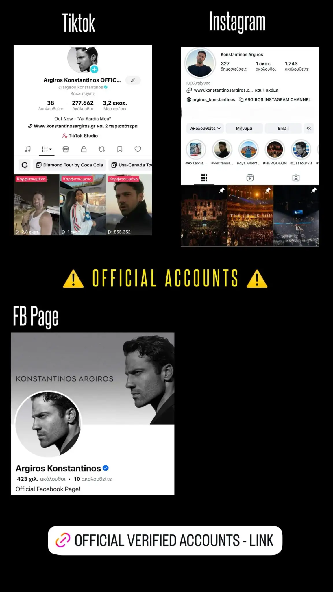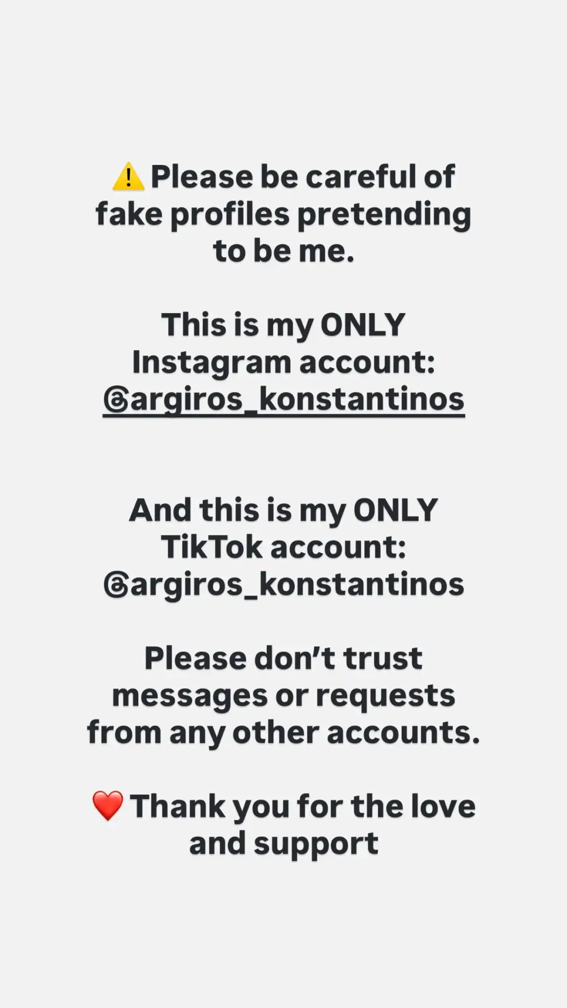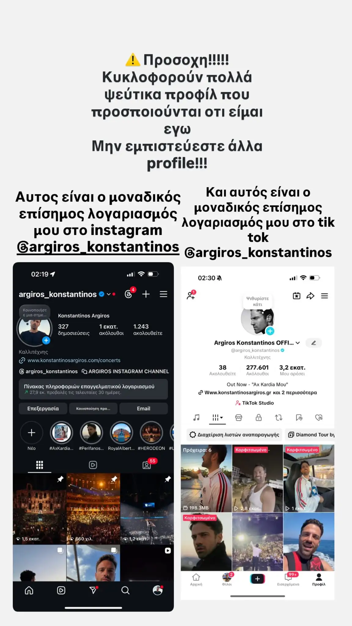 «Προσοχή!!! Κυκλοφορούν πολλά ψεύτικα προφίλ που προσποιούνται ότι είμαι εγώ. Μην εμπιστεύεστε άλλα προφίλ!!! Αυτός είναι ο μοναδικός λογαριασμός μου στο Instagram και αυτός είναι ο μοναδικός επίσημος λογαριασμός μου στο Tik Tok. Μην εμπιστεύεστε μηνύματα και αιτήματα από άλλους λογαριασμούς. Σας ευχαριστώ για την στήριξη» γράφει ο Κωνσταντίνος Αργυρός.