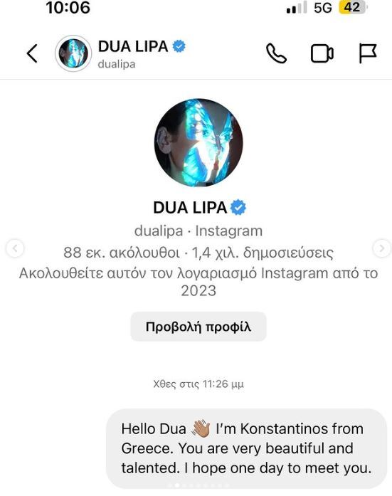 Ωστόσο, δημοσίευσε και ένα μήνυμα που έστειλε στη Dua Lipa, στο οποίο της γράφει: «Γεια σου Ντούα. Είμαι ο Κωνσταντίνος από την Ελλάδα. Είσαι πολύ όμορφη και ταλαντούχα. Ελπίζω μια μέρα να σε συναντήσω».