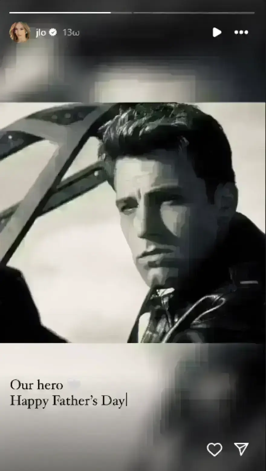 «Ο ήρωάς μας. Χαρούμενη Ημέρα του Πατέρα», έγραψε η Λόπεζ, μαζί με μια φωτογραφία του Άφλεκ από τα παλιά με ένα μαύρο δερμάτινο μπουφάν.