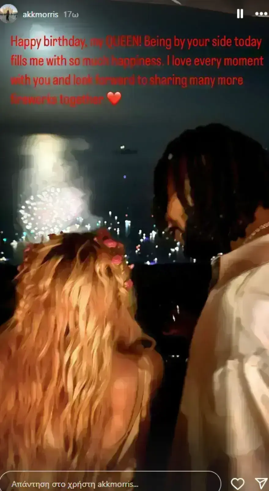 Και ο Μόρις έκανε όμως μια ανάρτηση για τη σύντροφό του. Ανέβασε σε story στο Instagram, ένα στιγμιότυπο από το πάρτι με τα βεγγαλικά για την τραγουδίστρια. Στη λεζάντα, ο νεαρός από την Τζαμάικα έγραψε: «Χρόνια πολλά βασίλισσά μου. Το να είμαι στο πλευρό σου σήμερα, με γεμίζει με τόση χαρά. Αγαπώ την κάθε στιγμή μαζί σου και ανυπομονώ να μοιραστώ μαζί σου πολλά περισσότερα βεγγαλικά».