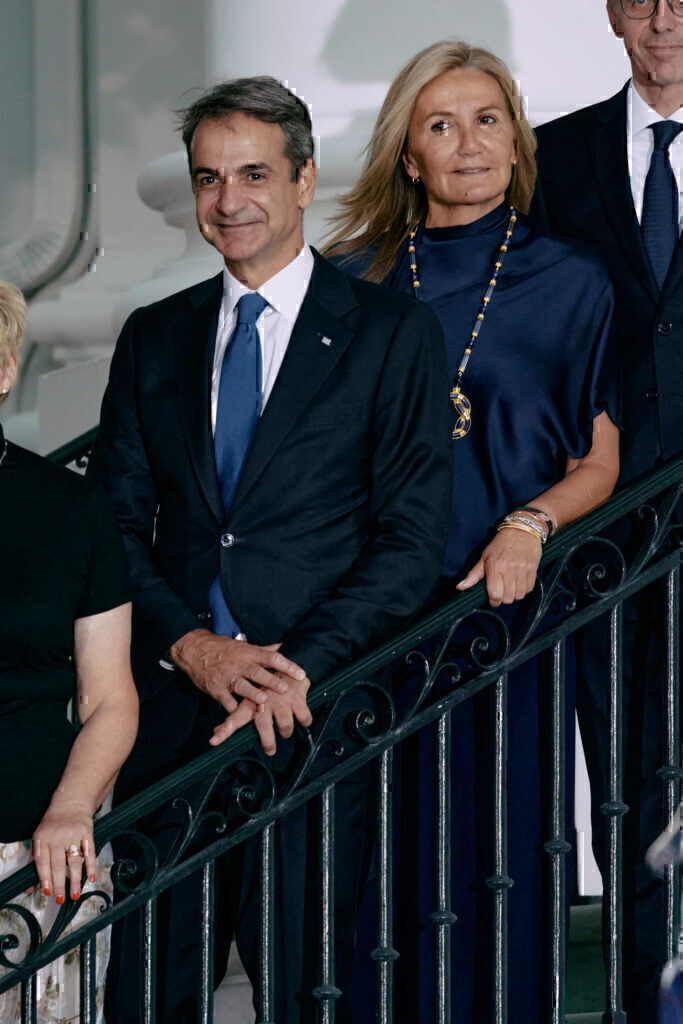 Η Μαρέβα Μητσοτάκη φόρεσε ένα blue navy σύνολο, με σατέν τοπ και παντελόνι, ενώ τον λαιμό της κόσμισε ένα εντυπωσιακό κόσμημα.