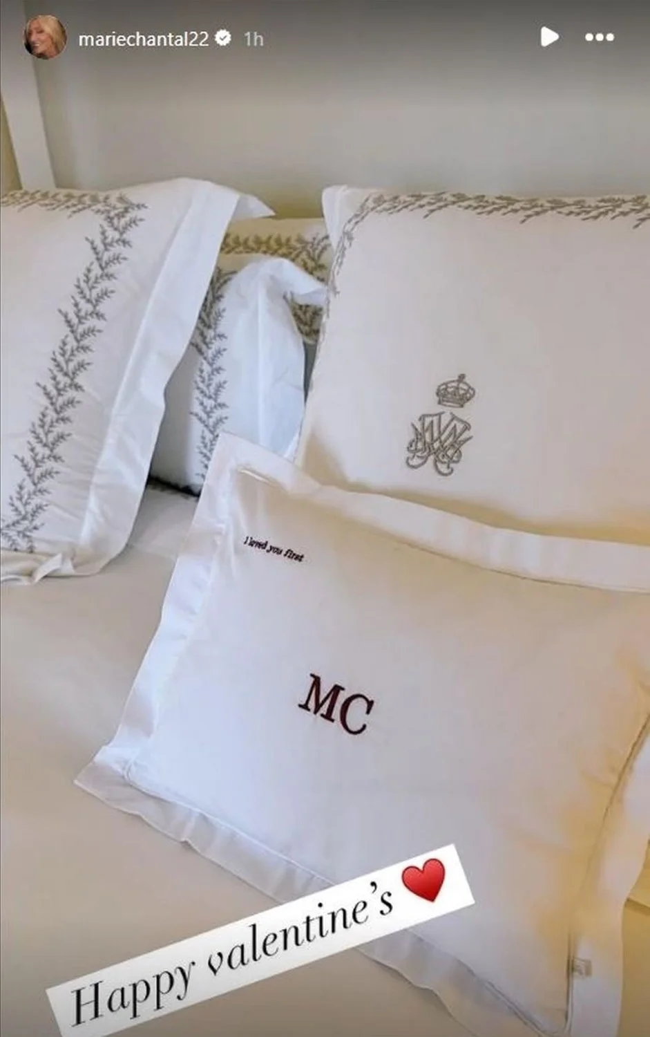 Στο στόρυ που έκανε η Μαρί Σαντάλ στο Instagram φαίνεται ένα μαξιλάρι με τα αρχικά της «MC» και η φράση «l loved you first» Σε αγάπησα πρώτη) στη μαξιλαροθήκη.