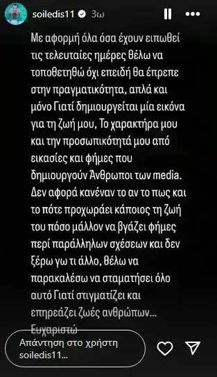 «Με αφορμή όλα όσα έχουν ειπωθεί τις τελευταίες ημέρες θέλω να τοποθετηθώ όχι επειδή θα έπρεπε στην πραγματικότητα, απλά και μόνο γιατί δημιουργείται μια εικόνα για τη ζωή μου, τον χαρακτήρα μου και την προσωπικότητά μου από εικασίες και φήμες που δημιουργούν άνθρωποι των media. Δεν αφορά κανέναν το αν, το πώς και το πότε προχωράει κάποιος τη ζωή του. Πόσο μάλλον να βγάζει φήμες περί παράλληλων σχέσεων και δεν ξέρω γω τι άλλο. Θέλω να παρακαλέσω να σταματήσει όλο αυτό γιατί στιγματίζει και επηρεάζει ζωές ανθρώπων. Ευχαριστώ», έγραψε χαρακτηριστικά ο Άρης Σοϊλέδης.