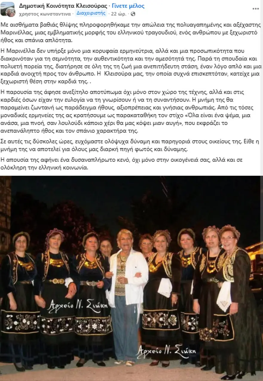 «Με αισθήματα βαθιάς θλίψης πληροφορηθήκαμε την απώλεια της πολυαγαπημένης και αξέχαστης Μαρινέλλας, μιας εμβληματικής μορφής του ελληνικού τραγουδιού, ενός ανθρώπου με ξεχωριστό ήθος και σπάνια απλότητα. Η Μαρινέλλα δεν υπήρξε μόνο μια κορυφαία ερμηνεύτρια, αλλά και μια προσωπικότητα που διακρινόταν για τη σεμνότητα, την αυθεντικότητα και την αμεσότητά της. Παρά τη σπουδαία και πολυετή πορεία της, διατήρησε σε όλη της τη ζωή μια ανεπιτήδευτη στάση, έναν λόγο απλό και μια καρδιά ανοιχτή προς τον άνθρωπο. Η Κλεισούρα μας, την οποία συχνά επισκεπτόταν, κατείχε μια ξεχωριστή θέση στην καρδιά της» ανέφερε η Πρόεδρος της Δημοτικής Ενότητας Κλεισούρας, Κωνσταντίνα Χήτα, προσθέτοντας πως «η παρουσία της άφησε ανεξίτηλο αποτύπωμα όχι μόνο στον χώρο της τέχνης, αλλά και στις καρδιές όσων είχαν την ευλογία να τη γνωρίσουν ή να τη συναντήσουν. Η μνήμη της θα παραμείνει ζωντανή ως παράδειγμα ήθους, αξιοπρέπειας και γνήσιας ανθρωπιάς. Από τις τόσες μοναδικές ερμηνείες της ας κρατήσουμε ως παρακαταθήκη τον στίχο «Όλα είναι ένα ψέμα, μια ανάσα, μια πνοή, σαν λουλούδι κάποιο χέρι θα μας κόψει μιαν αυγή», που εκφράζει το ανεπανάληπτο ήθος και τον σπάνιο χαρακτήρα της. Σε αυτές τις δύσκολες ώρες, ευχόμαστε ολόψυχα δύναμη και παρηγοριά στους οικείους της. Είθε η μνήμη της να αποτελεί για όλους μας διαρκή πηγή φωτός και δύναμης. Η απουσία της αφήνει ένα δυσαναπλήρωτο κενό, όχι μόνο στην οικογένειά σας, αλλά και σε ολόκληρη την ελληνική κοινωνία».