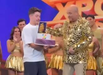Πιο συγκεκριμένα, στη σκηνή του Δελφιναρίου, ανέβηκε ο γιος του κρατώντας μία τούρτα. Δίπλα τους βρισκόταν και η Έλενα Τσαβαλιά.