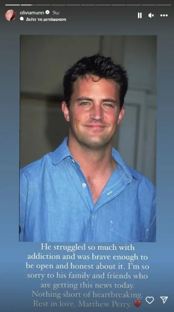 H Ολίβια Μαν εξέφρασε τη θλίψη της μέσα από ένα Instagram story στο οποίο ανέφερε για τον Μάθιου Πέρι: «Πάλεψε τόσο πολύ με τους εθισμούς και ήταν αρκετά γενναίος για να είναι ανοιχτός και ειλικρινής με αυτό. Λυπάμαι πολύ για την οικογένεια και τους φίλους του που μαθαίνουν αυτά τα νέα σήμερα. Μου ραγίζει την καρδιά. Αναπαύσου εν ειρήνη, Μάθιου Πέρι».