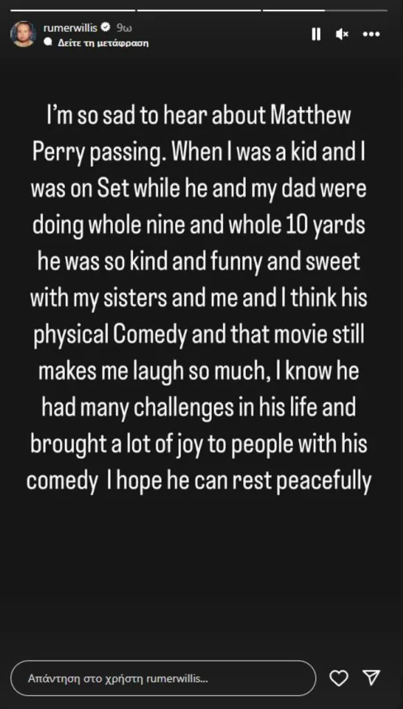 Η Ράμερ Γουίλις, κόρη του Μπρους Γουίλις, έγραψε σε story της στο Instagram, για τον ηθοποιό: «Ξέρω ότι είχε αντιμετωπίσει πολλές προκλήσεις στη ζωή και έφερε πολύ χαρά στους ανθρώπους με την κωμωδία του και ελπίζω να αναπαυθεί ειρηνικά».