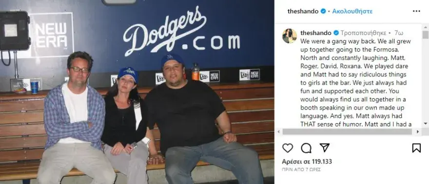 Η Σάνεν Ντόχερτι μίλησε για εκείνον και τα όσα έζησαν μαζί στα πιο νεανικά τους χρόνια, σε μια ανάρτηση στο Instagram. «Ήμασταν συμμορία τότε. Μεγαλώσαμε όλοι μαζί και συνέχεια γελούσαμε, ο Matt, ο Roger, ο David, η Roxana. Παίζαμε θάρρος ή αλήθεια και ο Matt έπρεπε να πάει να πει γελοία πράγματα στα κορίτσια στα μπαρ. Πάντα διασκεδάζαμε και στηρίζαμε ο ένας τον άλλο. Θα μας έβρισκες πάντα σε ένα τραπέζι να μιλάμε τη δική μας γλώσσα. Και ναι, ο Matt είχε πάντα αυτή την αίσθηση του χιούμορ. Ο Matt κι εγώ βγήκαμε μία φορά και ήταν του Αγίου Βαλεντίνου. Ήθελε να κάνει κράτηση σε ένα εστιατόριο στο Malibu αλλά δεν μπορούσε οπότε ο μπαμπάς μου το έκανε γι’ αυτόν. Πήγαμε στο δείπνο και έλεγε για τον μπαμπά μου και την ιρλανδική πειστικότητά του την περισσότερη βραδιά. Η φιλία μας κράτησε πολλά χρόνια. Μία ζωή στην πραγματικότητα. Ξέρω πως πολλοί πονούν, ειδικά η μικρή συμμορία μας. Θα λείψει σε πολλούς και σίγουρα σε εμάς. Ναι. Θα μπορούσα να τα πω πιο ποιητικά ή καλύτερα, αλλά αυτή τη στιγμή το σοκ και η θλίψη κυριαρχούν», έγραψε.