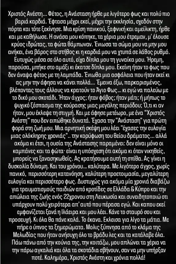 «Χριστός Ανέστη… Φέτος, η Ανάσταση ήρθε με λιγότερο φως και πολύ πιο βαριά καρδιά. Έφτασα μέχρι εκεί, μέχρι την εκκλησία, σχεδόν στην πόρτα και τότε ξεκίνησε. Μία κρίση πανικού, ξαφνική και αμείλικτη, ήρθε και με καθήλωσε. Η ανάσα μου κόπηκε, τα χέρια μου έτρεμαν, με έλουσε κρύος ιδρώτας, τα φώτα θάμπωναν. Ένιωσε το σώμα μου να μη μου ανήκει, ένα βάρος στο στήθος και η καρδιά μου να χτυπά σε λάθος ρυθμό.