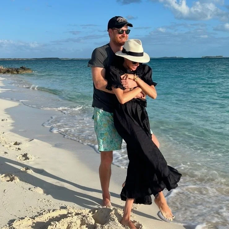 H Λλιμπετ φορά ένα ροζ μπλουζάκι και ένα φλοράλ κολάν και τα μαλλιά της είναι πιασμένα σε μια αλογοουρά. Ο Χάρι, που φορά ριγέ μαγιό, t-shirt και καπέλο και γυαλιά ηλίου, της δίνει ένα τρυφερό φιλί στο κεφάλι.