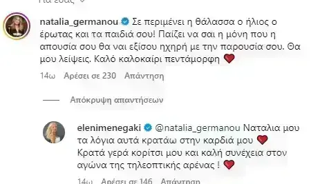 «Σε περιμένει η θάλασσα ο ήλιος ο έρωτας και τα παιδιά σου! Παίζει να σαι η μόνη που η απουσία σου θα ναι εξίσου ηχηρή με την παρουσία σου. Θα μου λείψεις. Καλό καλοκαίρι πεντάμορφη» σχολίασε χαρακτηριστικά η Ναταλία Γερμανού με την Ελένη Μενεγάκη να της απαντά, «Ναταλία μου τα λόγια αυτά κρατάω στην καρδιά μου Κρατά γερά κορίτσι μου και καλή συνέχεια στον αγώνα της τηλεοπτικής αρένας!».