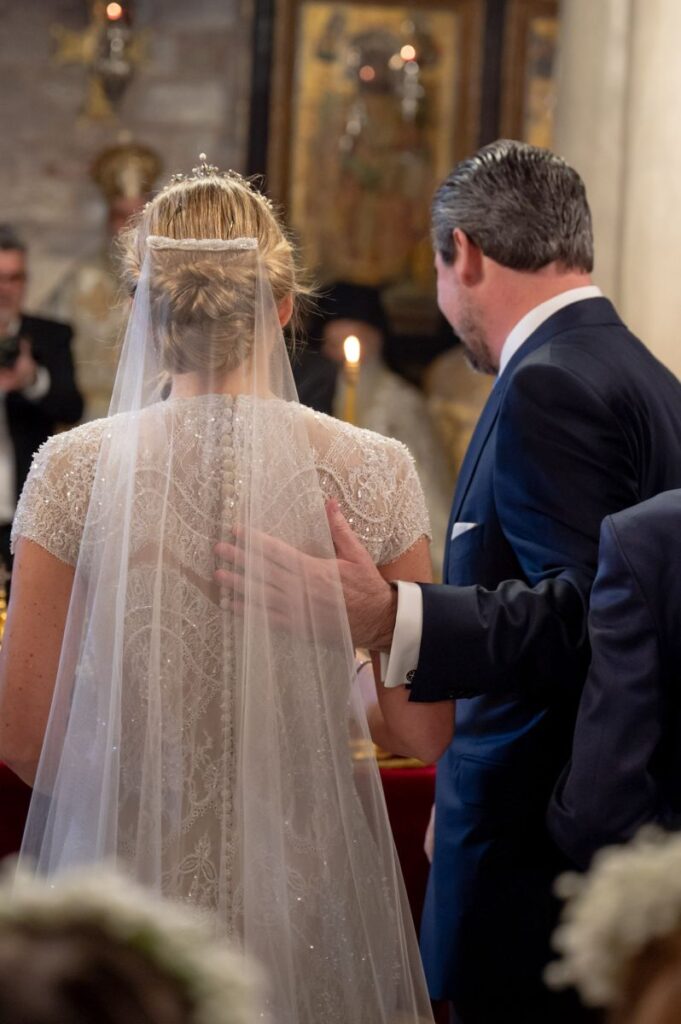 Στη δεύτερη φωτογραφία βλέπουμε ένα πολύ τρυφερό στιγμιότυπο από την τέλεση του μυστηρίου όπου ο Νικόλας Ντε Γκρες ακουμπά με αγάπη το χέρι του στην πλάτη της γυναίκας του.