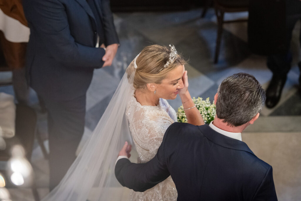 Η νύφη επέλεξε ένα φόρεμα σε nude τόνο κεντημένο με Swarovski, κλειστό μέχρι πάνω και με κοντό μανίκι. Τα μαλλιά της ήταν πιασμένα χαλαρά ενώ ήταν στολισμένα με μία τιάρα και ένα μακρύ εντυπωσιακό πέπλο.