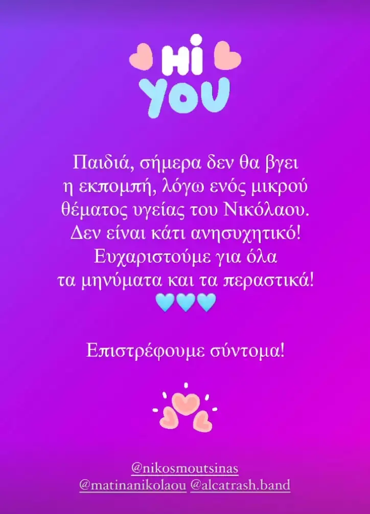 «Το μόνο σίγουρο είναι ότι το “Καλό Μεσημεράκι” δεν θα βγει σήμερα και το πιθανότερο είναι να μην βγει και όλη την εβδομάδα. Ωστόσο, ο Νικός Μουτσινάς είναι καλά δεν είναι κάτι σοβαρό», πρόσθεσε σχετικά με την εκπομπή και το μέλλον της εκπομπής τις επόμενες μέρες.