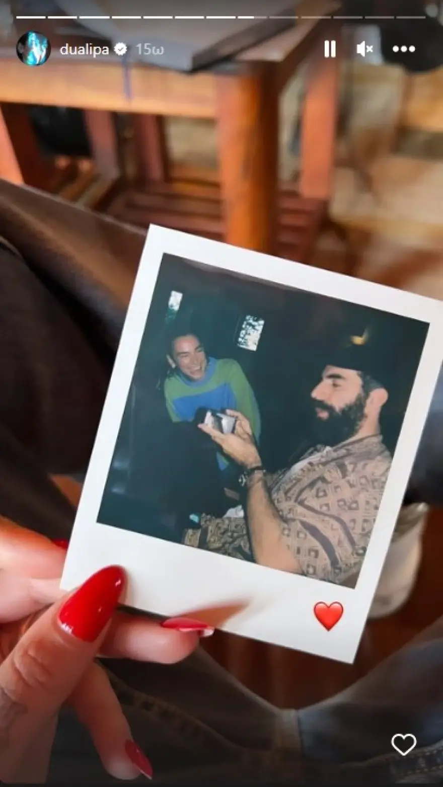 Στο στιγμιότυπο εμφανίζεται το χέρι της Λίπα να κρατάει μια φωτογραφία polaroid όπου φαίνεται να γελάει με τον Γαβράς. Αυτή είναι η πρώτη φορά που οι δυο τους δημοσιοποιούν τη σχέση.