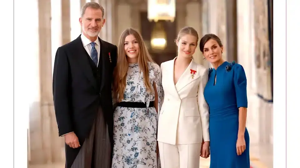 Η χριστουγεννιάτικη κάρτα της ισπανικής βασιλικής οικογένειας τραβήχτηκε σε μια πολύ ιδιαίτερη μέρα, τα 18α γενέθλια της πριγκίπισσας Λεονόρ. Η Ισπανίδα διάδοχος του θρόνου γιόρτασε το ορόσημό της στις 31 Οκτωβρίου, όταν συμμετείχε σε τελετή ορκωμοσίας ενώπιον του Cortes Generales. Η Leonor φαινόταν κομψή με λευκό κοστούμι, ενώ η μικρότερη αδερφή της, Infanta Sofia, 16 ετών, φορούσε ένα όμορφο λευκό και μπλε φλοράλ φόρεμα. Το μπλε φόρεμα της βασίλισσας Λετίθια συμπλήρωνε τα σύνολα των κορών της, ενώ ο βασιλιάς φορούσε μια μπλε γραβάτα με σχέδια.
