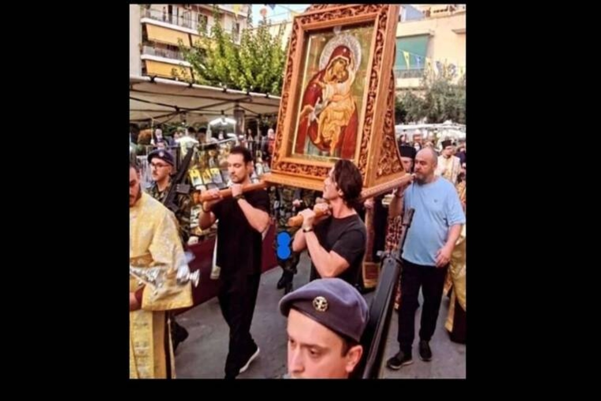 Ο φωτογραφικός φακός αποθανάτισε τον Νίκο Οικονομόπουλο και τον Τζίμη Σταθοκωστόπουλο να σηκώνουν στα χέρια τους την ιερή εικόνα μαζί και με άλλους πιστούς. Φαίνονταν, μάλιστα, συγκινημένοι, ενώ δεν παρέλειψαν, μόλις την επέστρεψανστην εκκλησία, να προσκυνήσουν στη Χάρη της Παναγίας.