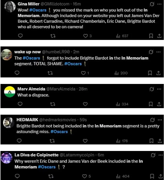 Στο X εξέφρασαν τη διαφωνία και την απορία τους για την παράλειψη, με σχόλια όπως «Γιατί δεν συμπεριλήφθηκαν οι Έρικ Ντέιν και Τζέιμς Βαν Ντερ Μπικ στο In Memoriam;» ή «Η απουσία της Μπριζίτ Μπαρντό είναι πραγματικά σοκαριστική». Ορισμένοι χαρακτήρισαν την παράλειψη «ντροπιαστική».
