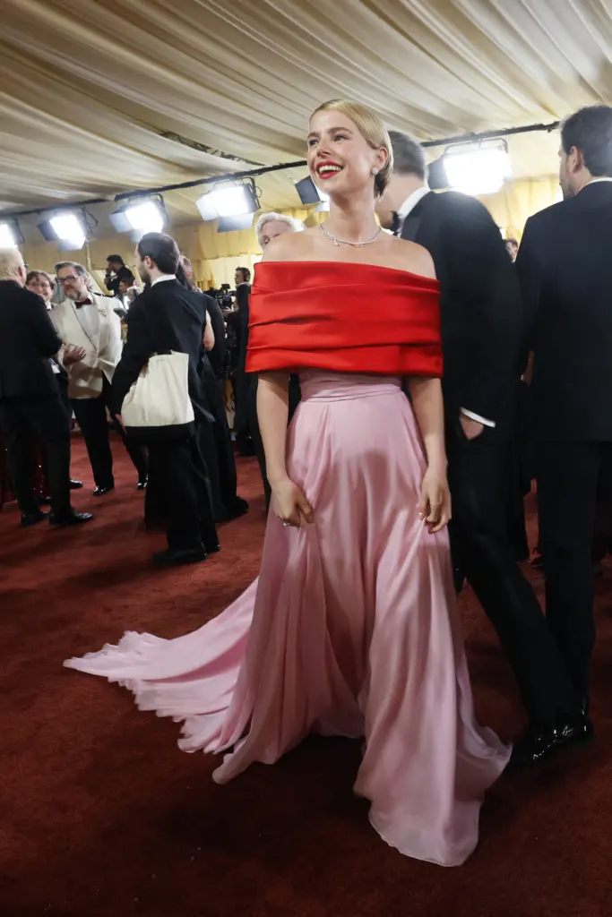 Η Τζέσι Μπάκλεϊ, που κέρδισε το Όσκαρ του Α’ γυναικείου ρόλου, άνοιξε τον δρόμο της κομψότητας με μια δημιουργία Chanel που αποτέλεσε ωδή στη Grace Kelly, συνδυάζοντας το bubblegum pink με το κόκκινο.