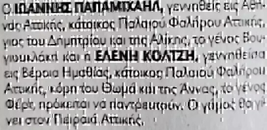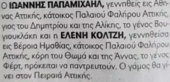 Ο 54χρονος γιος της Αλίκης Βουγιουκλάκη και του Δημήτρη Παπαμιχαήλ θα παντρευτεί την αγαπημένη του στον Πειραιά, ενώ όπως διαβάζουμε στην αναγγελία του γάμου τους, η σύντροφός του ονομάζεται Ελένη Κολτζή.