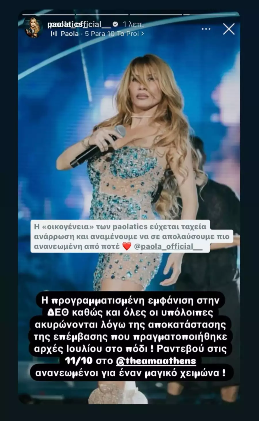 «Η προγραμματισμένη εμφάνιση στη ΔΕΘ καθώς και όλες οι υπόλοιπες ακυρώνονται λόγω της αποκατάστασης της επέμβασης που πραγματοποιήθηκε αρχές Ιουλίου στο πόδι! Ραντεβού στις 11/10 στο Theamaathens ανανεωμένοι για ένα μαγικό χειμώνα!».