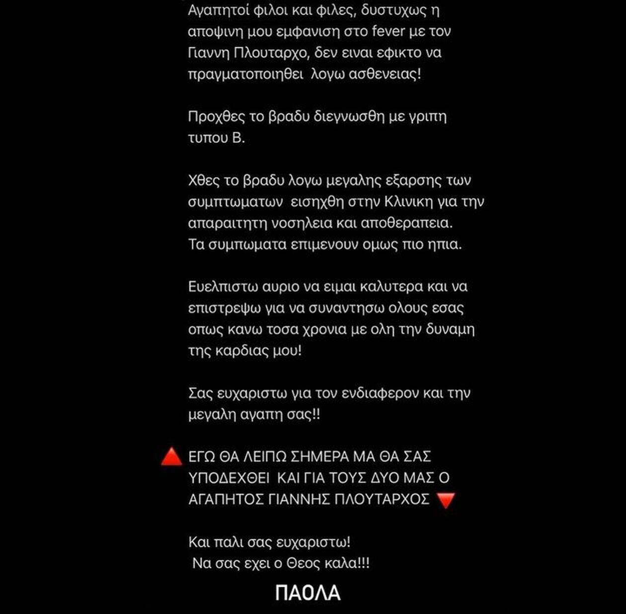 Εγώ θα λείπω σήμερα μα θα σας υποδεχτεί και για τους δυο μας ο αγαπητός Γιάννης Πλούταρχος. Και πάλι σας ευχαριστώ, Να σας έχει ο Θεός καλά», έγραψε στην ανάρτησή της η Πάολα.