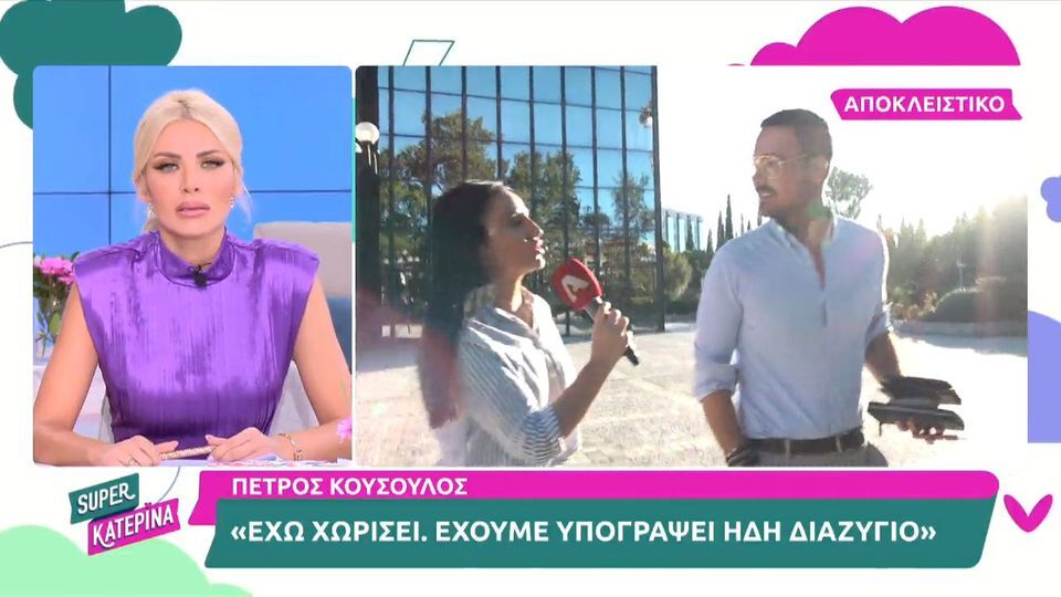 Είναι συναινετικό διαζύγιο γιατί είμαστε πολιτισμένοι άνθρωποι και έχουμε και δύο παιδιά. Το επόμενο βήμα είναι αφιερωμένο στη δουλειά και τα παιδιά μου», είπε χαρακτηριστικά ο Πέτρος Κουσουλός.