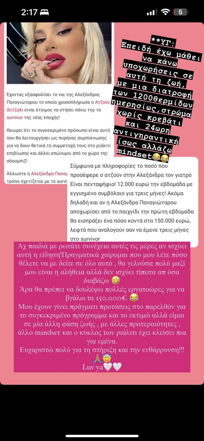 “Αχ παιδιά με ρωτάτε συνέχεια αυτές τις ημέρες αν ισχύει αυτή η είδηση. Πραγματικά χαίρομαι που μου λέτε πόσο θέλετε να με δείτε σε όλο αυτό, θα γελούσα πολύ μαζί μου είναι η αλήθεια αλλά δεν ισχύει τίποτα από όσα διαβάζω. Άρα θα πρέπει να δουλέψω πολλές εργατοώρες για να βγάλω τα 150.000 ευρώ. Μου έχουν γίνει πράγματι προτάσεις στο παρελθόν για το συγκεκριμένο πρόγραμμα και το εκτιμώ αλλά είμαι σε μία άλλη φάση ζωής, με άλλες προτεραιότητες, άλλο mindset και ο κύκλος των ριάλιτι έχει κλείσει πια για εμένα. Ευχαριστώ πολύ για τη στήριξη και την ενθάρρυνση! Luv ya! Επειδή έχω μάθει να κάνω υποχωρήσεις σε αυτή τη ζωή, με μία διατροφή των 1200 θερμίδων ημερησίως, στρώμα χωρίς κρεβάτι και 24ωρη αντιγηραντική, ίσως αλλάξω mindset”, έγραψε χαρακτηρστικά.