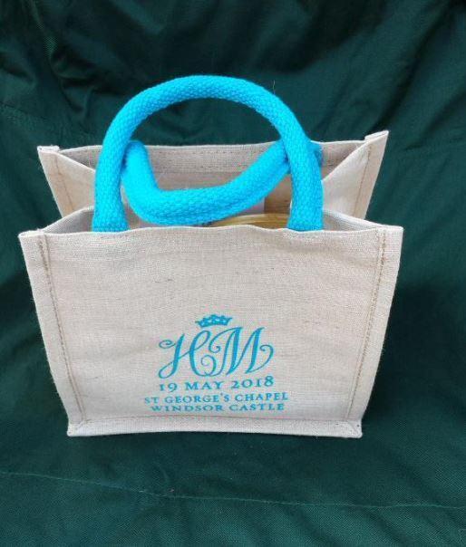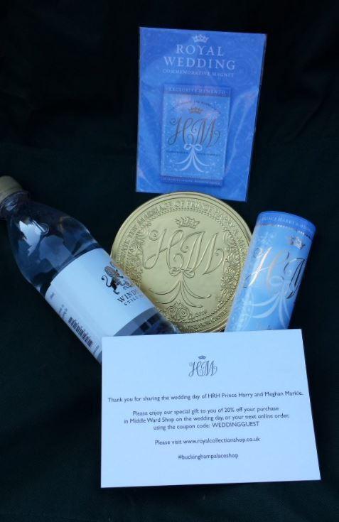 Οι τσάντες με τα αρχικά των νεόνυμφων και την ημερομηνία τέλεσης του μυστηρίου σκαλισμένα πάνω τους, περιείχαν ένα γιγάντιο νόμισμα σοκολάτας, ένα κουλουράκι, έναν μαγνήτη ψυγείου και ένα κουπόνι με 20% έκπτωση στο κατάστημα δώρων του κάστρου. Επιπλέον, είχαν ένα μπουκάλι νερού από το κάστρο του Ουίνδσορ και το πρόγραμμα του γάμου.