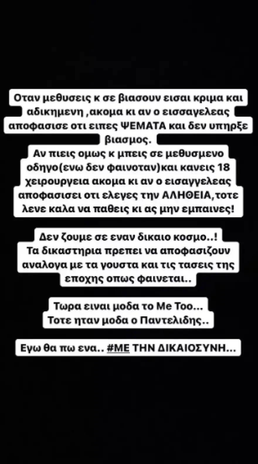 Στη συνέχεια συμπλήρωσε: «Δεν ζούμε σε έναν δίκαιο κόσμο! Τα δικαστήρια πρέπει να αποφασίζουν ανάλογα με τα γούστα και τις τάσεις της εποχής, όπως φαίνεται. Τώρα είναι μόδα το #metoo, τότε ήταν μόδα ο Παντελίδης. Εγώ ένα θα πω. Με τη δικαιοσύνη».