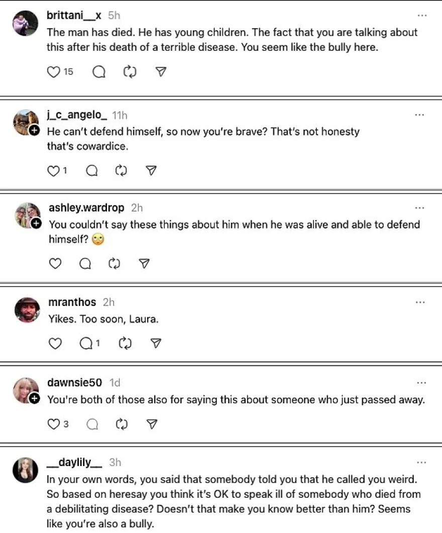 Οι αναρτήσεις της προκάλεσαν άμεση αντίδραση, με αρκετούς να σχολιάζουν: «Ο άνθρωπος μόλις πέθανε και έχει μικρά παιδιά, ντροπή σου», «Τώρα που δεν μπορεί να υπερασπιστεί τον εαυτό του μιλάς;», «Φαίνεται πως ο bully είσαι εσύ», ενώ δεν έλειψαν και εκείνοι που επεσήμαναν ότι η χρονική στιγμή των δηλώσεων είναι ακατάλληλη.