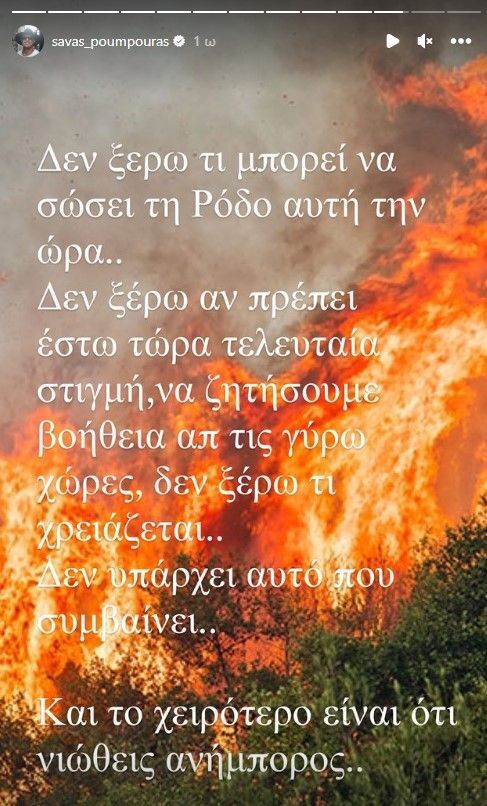 Να υπενθυμίσουμε πως αρχικά ο Σάββας Πούμπουρας ανήρτησε ένα βίντεο στο Instagram, στο οποίο ανακοίνωσε στους ακολούθους του πως πηγαίνει στο νησί για να βοηθήσει όπως μπορεί κάνοντας στην ουσία κάλεσμα για βοήθεια