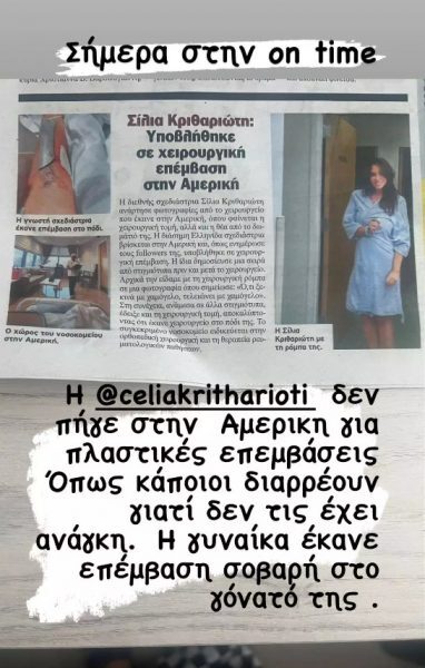«Η Σήλια Κριθαριώτη δεν πήγε στην Αμερική για πλαστικές επεμβάσεις, όπως κάποιοι διαρρέουν, γιατί δεν τις έχει ανάγκη. Η γυναίκα έκανε επέμβαση σοβαρή στο γόνατο της» έγραψε χαρακτηριστικά η γνωστή δημοσιογράφος Σάσα Σταμάτη.
