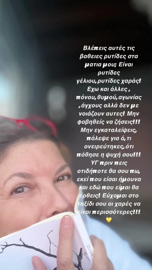 Η Σοφία Αλιμπέρτη γράφει στο στόρι: «Βλέπεις αυτές τις βαθιές ρυτίδες στα μάτια μου; Είναι ρυτίδες γέλιου, ρυτίδες χαράς! Έχω και άλλους, πόνου, θυμού, αγωνίας, άγχους, αλλά δεν με νοιάζουν αυτές. Μην φοβηθείς να ζήσεις! Μην εγκαταλείψεις, πάλεψε για ό,τι ονειρεύτηκες, ό,τι πόθησε η ψυχή σου! Υ.Γ. Πριν πεις οτιδήποτε θα σου πω, εκεί που είσαι ήμουνα και εδώ και είμαι θα έρθεις! Εύχομαι στο ταξίδι σου οι χαρές να είναι περισσότερες».