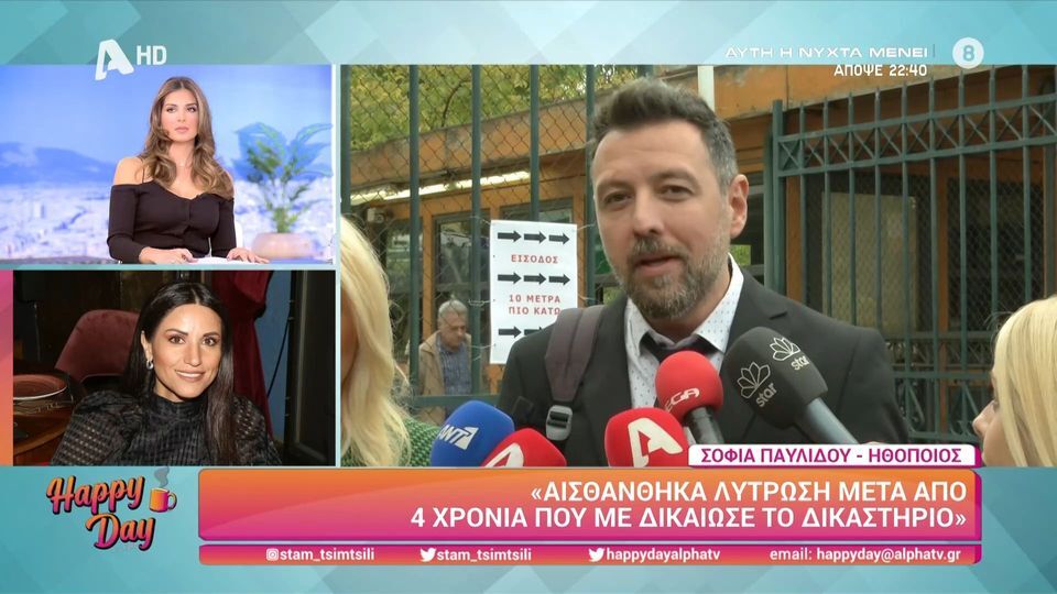 «Εμένα δεν με αφορά η ποινή, το δικαστήριο ξέρει γιατί έβαλε αυτή την ποινή, έχει τα κριτήριά του και έβαλε μια ποινή. Εμένα δεν με ενδιαφέρει να τιμωρήσω κάποιον. Η ουσία είναι η δική μου αθώωση και η δική του ενοχή. Νιώθω μεγάλη ικανοποίηση και δικαίωση μετά από τέσσερα χρόνια. Δικαιώνομαι διπλά για τη μήνυση που μου είχε κάνει για τις επικίνδυνες σωματικές βλάβες που του είχα προκαλέσει» είπε αρχικά η Σοφία Παυλίδου μιλώντας στην εκπομπή Happy Day.