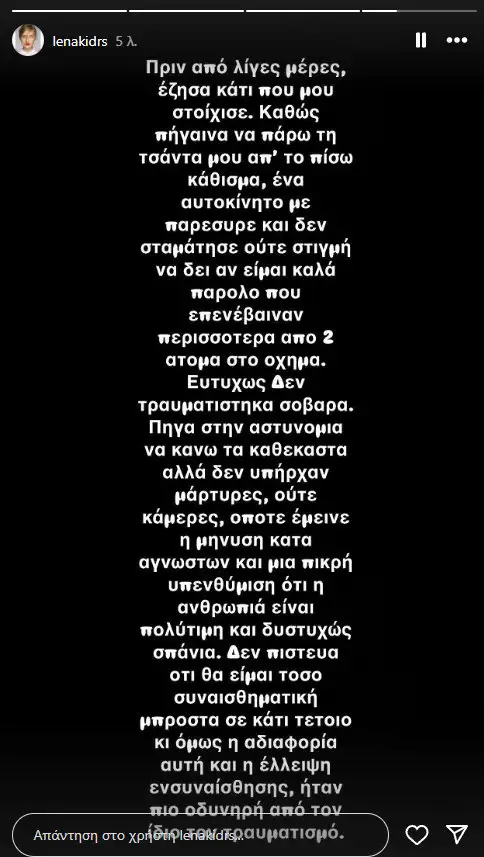 «Πριν από λίγες μέρες έζησα κάτι που με στοίχισε. Καθώς πήγαινα να πάρω την τσάντα μου απ’ το πίσω κάθισμα, ένα αυτοκίνητο με παρέσυρε και δεν σταμάτησε ούτε στιγμή να δει αν είμαι καλά, παρόλο που επέβαιναν περισσότερα από 2 άτομα στο όχημα.