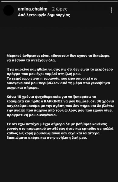 Κάνω 15 χρόνια ψυχοθεραπεία για να ξεπεράσω τα τραύματα και ήρθε ο καρκίνος να μου θυμίσει ότι 36 χρόνια ασχολούμαι ακόμα με την αγάπη που δεν πήρα και δεν βλέπω την αγάπη που παίρνω από τους φίλους μου που έχουν γίνει πραγματική μου οικογένεια. Σε ότι έχω πετύχει μέχρι σήμερα δεν με βοήθησε κανένας γονιός στο παραμικρό. Αντιθέτως ήταν και εμπόδιο σε πολλά, καθώς ως κόρη μουσουλμάνου δεν είχα και ιδιαίτερα δικαιώματα ακόμα και στην ενήλικη ζωή μου.