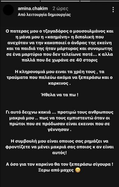 Ο πατέρας μου ο τζογαδόρος ο μουσουλμάνος και η μάνα μου η “καημένη”, η διπολική που ανεχόταν να την κακοποιεί ο άντρας της εκείνη και τα παιδιά της. Ήταν μάρτυρας και συνωμότης σε ένα μαρτύριο που δεν τελείωνε ποτέ.. κ άλλα πολλά που δε χωράνε σε 40 στορις. Η κληρονομιά μου είναι τα χρέη τους, τα τραύματα που παλεύω ακόμα να ξεπεράσω και ο καρκίνος. Ήθελα να τα πω.