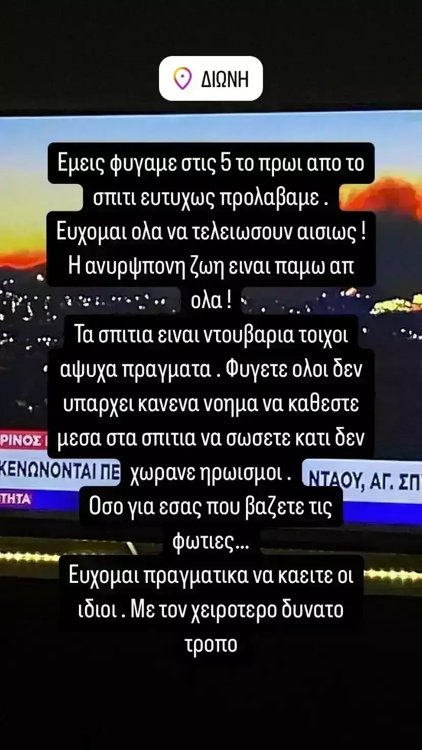 «Εμείς φύγαμε στις 5 το πρωί από το σπίτι. Ευτυχώς προλάβαμε. Εύχομαι όλα να τελειώσουν αισίως. Η ανθρώπινη ζωή είναι πάνω από όλα. Τα σπίτια είναι ντουβάρια, τοίχοι, άψυχα πράγματα. Φύγετε όλοι. Δεν υπάρχει κανένα νόημα να κάθεστε μέσα στα σπίτια να σώσετε κάτι. Δε χωράνε ηρωισμοί. Όσο για εσάς που βάζετε τις φωτιές… εύχομαι πραγματικά να καείτε οι ίδιοι. Με τον χειρότερο δυνατό τρόπο» έγραψε στην ανάρτησή του ο Στέλιος Λεγάκης.