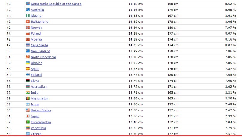 Το «χτύπημα» όμως δεν είναι μόνο για εμάς, αλλά και για τους Ισπανούς, με τους οποίους ανήκουμε πάνω κάτω στην ίδια κλίμακα. Οι Ισπανοί βρίσκονται στην 53η θέση με μέσο όρο πέους στα 13.85 εκατοστά.