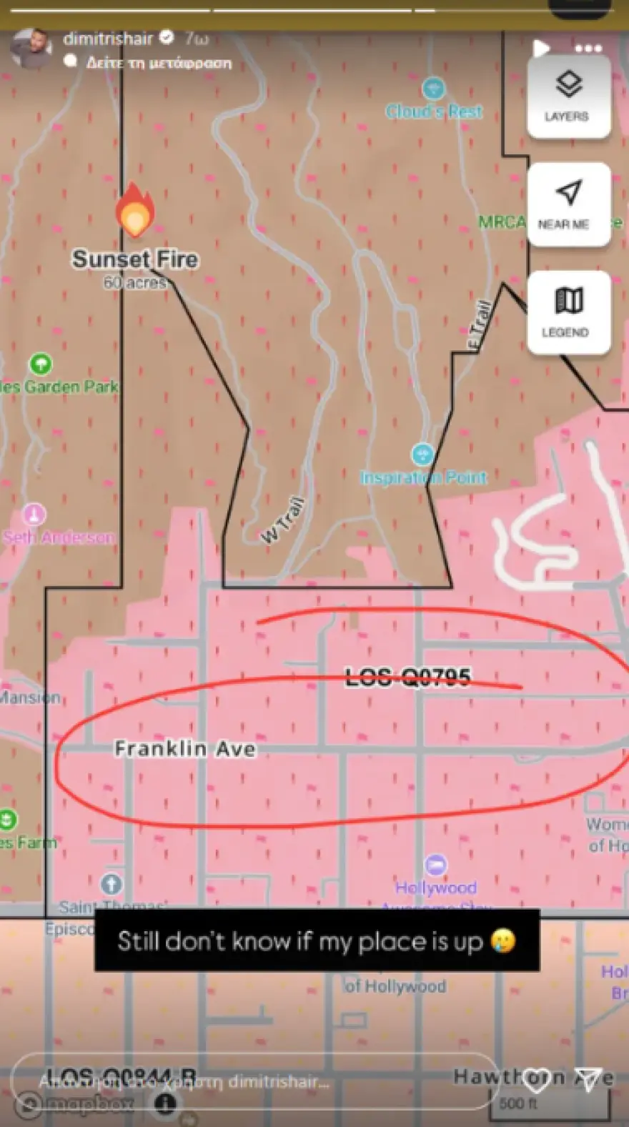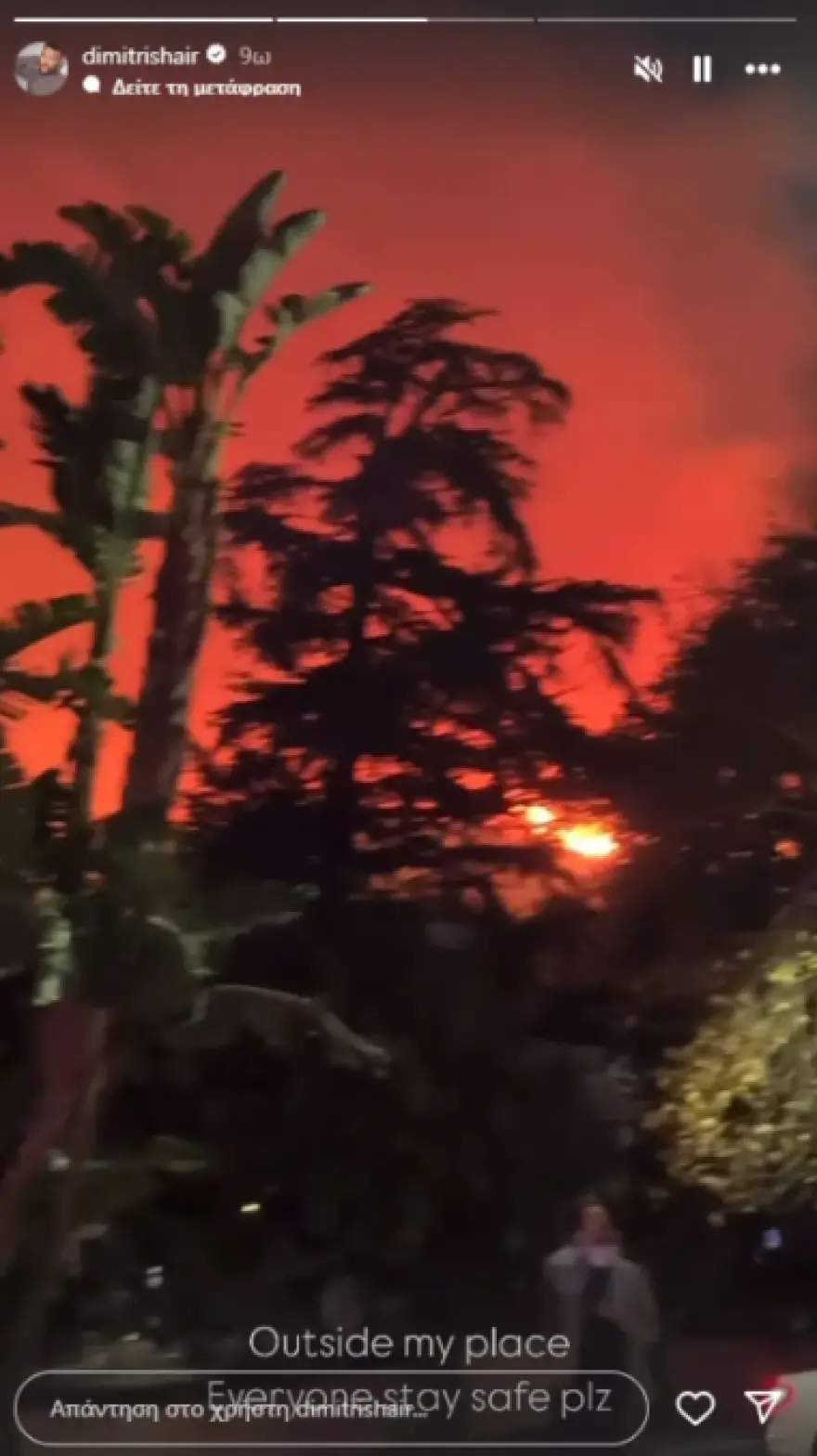 O Δημήτρης Γιαννέτος ενημέρωσε από την πρώτη στιγμή τους διαδικτυακούς του φίλους στο Instagram για την κατάσταση που επικρατεί και δημοσίευσε βίντεο από την περιοχή του, που δείχνει την πύρινη λαίλαπα σε κοντινή απόσταση από το σπίτι του. Σε story που ανέβασε στο Instagram, ο γνωστός hair stylist περιέγραψε τη δραματική κατάσταση που επικρατεί στο Λος Άντζελες και εξήγησε ότι η φωτιά κινούταν με τόσο γρήγορο ρυθμό, που αναγκάστηκε να εγκαταλείψει αμέσως το σπίτι του. Σε άλλο βίντεο που ανάρτησε στη συνέχεια, ενημέρωσε τους ακόλουθούς του ότι είναι πλέον, ασφαλής και βρίσκεται σε ξενοδοχείο, ενώ έδειξε και το καμμένο τοπίο.